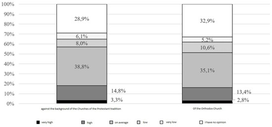 The image of the Catholic Church in Poland was also assessed against the background of the Churches of the Protestant tradition and the Orthodox Church (see Figure 3). More than 1/3 of respondents assessed the image of the Catholic Church in Poland as average, a large part of respondents (almost 1/3) have no opinion on this issue. Only 18.1% gave a high or very high mark as compared to the Protestant tradition churches, even less—16.2%—as compared to the Orthodox Church. The distribution of ratings does not depend on gender, age or education of respondents (p > 0.05 in chi-square independence tests). High or very high ratings of the Catholic Church in Poland compared to the Churches of the Protestant tradition were significantly more frequent among inhabitants of rural areas and small towns (this regularity does not occur in the case of the Catholic Church in Poland compared to the Churches of the Protestant tradition). What is rather obvious, the evaluation of the Catholic Church in Poland against other churches depends on the religion of the respondents, practicing Catholics rated highest (27.1% of respondents from this group rated the Catholic Church in Poland highly or very highly against the churches of the Protestant tradition and 22.3% against the Orthodox Church).