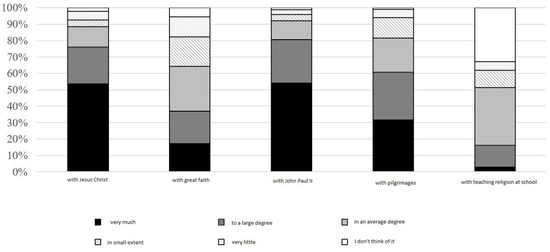 The study has shown that the Catholic Church in Poland is mainly associated with Christian values, i.e., Jesus Christ, deep faith, John Paul II, pilgrimages, religious instruction at school (see Figure 4). Most frequently, respondents associate the Catholic Church in Poland with John Paul II (80.7% associate it to a great or very great extent), Jesus Christ (76%), pilgrimages (60.7%), much less with deep faith (36.9%) or religious instruction at school (16.2%). These associations do not depend on the age or education of the respondents. In the case of some Christian values, differences can be observed in relation to gender and place of residence. Women significantly more often than men associate the Catholic Church in Poland with deep faith (38.7% of women associate it to a great or very great extent), with John Paul II (84%), with Jesus Christ (79.2%). Residents of rural areas and small towns are significantly more likely than residents of medium and large towns to associate the Catholic Church in Poland with John Paul II (86.6% of respondents living in rural areas and 90.3% of respondents living in small towns), and with Jesus Christ (85.8% and 80.5%, respectively).