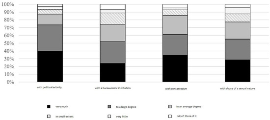 Negative elements of the image of the Catholic Church in Poland, i.e., conservatism, political activity, the bureaucratic nature of this institution, sexual abuse, also appear relatively frequently in associations with the Catholic Church (see Figure 5). Most often, respondents indicated associations with political activity (73.6% associate it to a great or very great extent) and conservatism (61.2%). The intensity of negative associations does not depend on gender, age, or education. In the case of associations with political activity and conservatism, it can be noted that they occur significantly more often among residents of large cities.