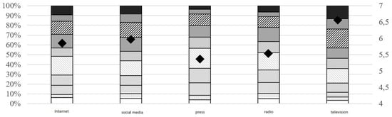 In the case of most media, i.e., the Internet, social media, press, radio, respondents most often marked a value of 5 on a scale of 1–10, and the average oscillated between 5 and 6. Perhaps surprisingly, the highest average in this group was obtained for social media. Half of the respondents rated the role of the Internet and social media no lower than 6, while in the case of the role of radio and press the median was 5. Moreover, 66.7% of those who expressed their opinion on the use of social media in building the image of the Catholic Church in Poland believe that the Catholic Church should increase the degree of its use in building its image. Statistical analysis showed no statistically significant differences in opinions on the role of various media in assisting image building in the subgroups of the study sample distinguished by gender, age, place of residence, education or religion.