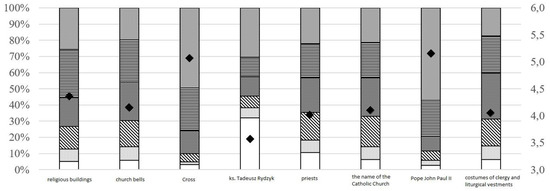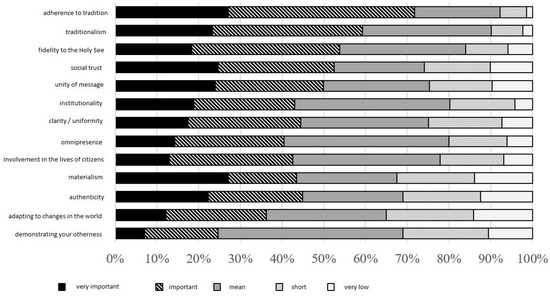 The following characteristics are attributed to the Catholic Church in Poland: attachment to tradition, traditionalism, faithfulness to the Holy See, social trust, unity of message, institutionality (large organisational structure), clarity/uniformity, omnipresence, involvement in the lives of citizens, materialism, authenticity, adapting to changes in the world, demonstrating its distinctiveness (the order results from the survey). It is worth noting the particularly high importance of issues related to tradition indicated by the respondents—71.8% of the respondents regarded attachment to tradition as an important or very important feature of the brand of the Catholic Church in Poland (see Figure 8).