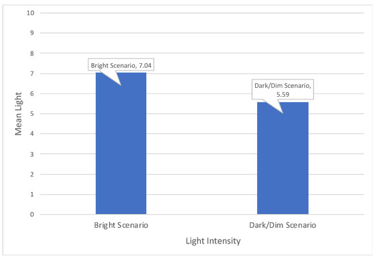 Figure 8 shows the comparison of means affirming light was indeed noticed by the participants more in the bright scenario with M = 7.04 than in the dark/dim one with a mean M = 5.59. These results enable us to conclude that light intensity manipulation was highly perceived by the participants in the whole sample and across both conditions.