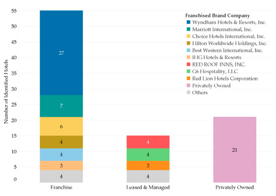 In addition, we analyzed the ownership type of each identified hotel. Hotel ownership can operate under a franchise model, a private-ownership model, or a leased and managed model. Under the franchise model, a franchisee pays a fee to a franchisor to use the franchisor’s brand and receive support in operating their business. Under the private ownership model, private hotel owners operate without the benefit or fees associated with franchised brands. In the leased and managed model, the hotel property owners hire a management company or have a lease with a corporation to operate the business.
