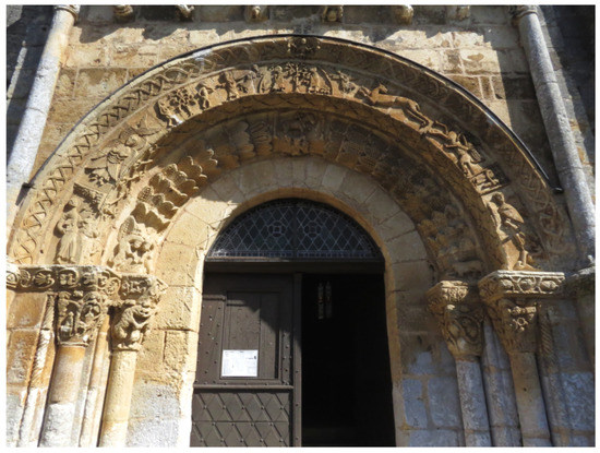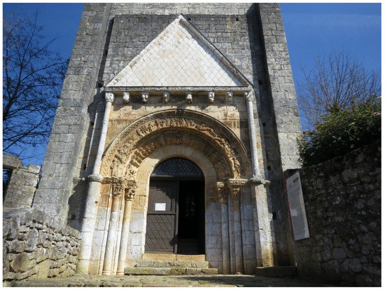 Situated in a charming village in the Périgord, the French Romanesque church of Saint-Martin-de-Besse presents a fascinating west façade, a rarity in the region (Figure 1 and Figure 2). The west façade of Besse includes a portal composed of a variety of isolated narratives from the Old and New Testaments, along with a scene from the story of an Early Christian figure, Saint Eustace. Saint-Martin-de-Besse has received little scholarly attention to date, with five publications mentioning its architectural and sculptural programme and the iconographical meaning of its portal (Brugière 1882, pp. 3–8; Secret 1968, pp. 227–32; Dubourg-Noves 1982; Saxon 2006, pp. 79–86 and Palazzo [2014] 2017). Archival materials on its architecture are rather modest as the rural church’s documents and archives, its surrounding monuments, and other associated buildings have not survived the test of time, numerous wars over the centuries, nor the French Revolution.2 As a result, retracing the building’s history is challenging, and proposing an exact date for its construction is difficult.