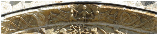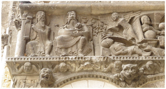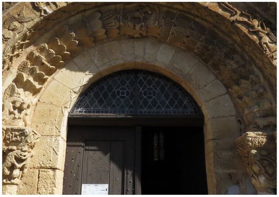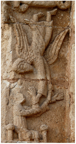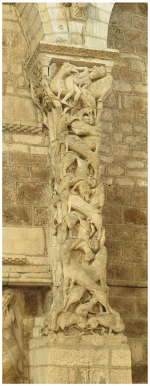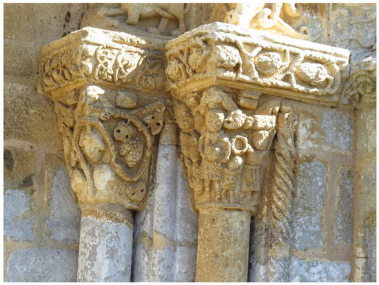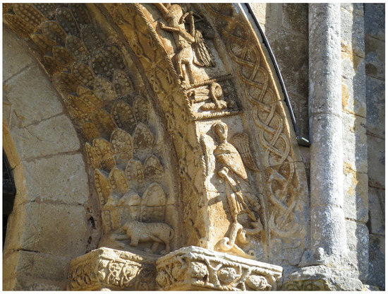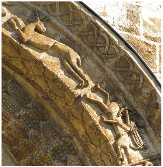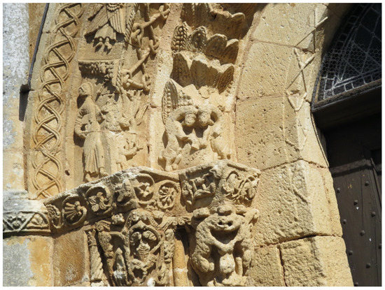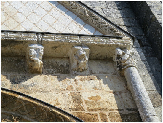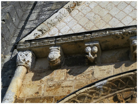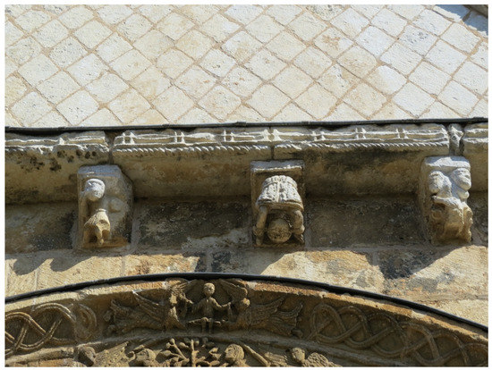 Two pairs of engaged colonettes flank the church’s entrance (Figure 3). They are separated from the archivolt by a frieze, on which are carved foliage and battles between men and animals (Figure 2(14), Figure 12 and Figure 13). From left to right, the capitals on the left-hand side depict foliage and two lions fighting (Figure 2(14) and Figure 12). The capital closest to the church’s entrance, on the right-hand side, is adorned with grapes and vines (Figure 2(13) and Figure 14). The adjacent column presents an enigmatic scene on each of its two faces: a demon holding a kneeling figure by its hair and a larger man standing with an outsized circular medallion as a necklace, holding the hand of a smaller child-like figure; and a woman carrying a bag on her head, holding a wreath-like object above a child-like figure’s head (Figure 2(12) and Figure 14). Six corbels are carved above the archivolts to support the triangular opus reticulatum representing the Trinity (Figure 2(E, 11) and Figure 15). The corbels represent, from left to right, a smiling animal head, a man and an ape eating, a musician, an acrobat, two figures embracing, and a tambourine player (Figure 2(11) and Figure 16, Figure 17, Figure 18). Two engaged colonettes with capitals, depicting foliage and humans fighting animals, support the opus reticulatum (Figure 15, Figure 16 and Figure 18).