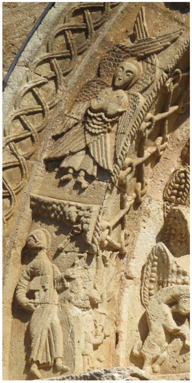 On the left-hand side of the archivolt’s outer face, next to the seated man, the prophet Isaiah is shown as being about to receive the touch of a burning coal to his lips; the scene is situated below a seraph with six wings and opened palms facing inward (Figure 2(1) and Figure 6) (Secret 1968, pp. 271–72).27 Isaiah gazes upward, toward the archivolt’s apex, at the figure in apotheosis. This narrative sequence refers to Isaiah 6:6–7: