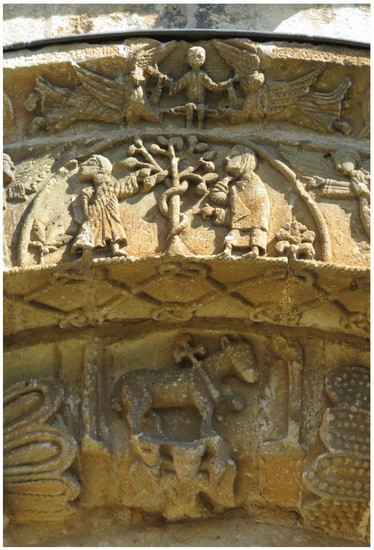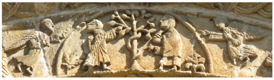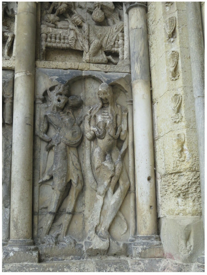 Covering her genitals with a leaf, a natural element from the harmonious Garden of Eden, Eve hides her body in shame, for it distorts the unity that exists between her soul and God. Eve’s flesh grounds her body and soul; since her conscience failed her, all she has left is her flesh, through which she will experience pain in childbirth; this is underlined visually by her placement of one hand under her breasts and the other over her genitals (Figure 24). Aware and ashamed of his nakedness, Adam too covers his genitals with one hand and his throat with the other. As he faces God’s accusations, his gesture signals the forbidden fruit stuck in his throat, a physiological feature that he passes on to his male descendants. His gesture may also denote that he is keeping silent because his mouth was the means by which he transgressed (Flood 2011, p. 96). On the church’s outer archivolt, Eve is also shown as being about to walk past the sophisticated Tree of Life in the Garden of Eden. Seduced by empty words and the idea of power through knowledge, Eve encouraged Adam to follow in her footsteps. In the Temptation and Fall of Eve, the Tree of Knowledge of Good and Evil “manifests itself as the Tree of Death” (Dercks 2014, p. 144 and Goetz 1965, pp. 20–21). Together, Adam and Eve left the Tree of Life, which God planted to give them eternal life through Beauty, Goodness, Truth, and Order.