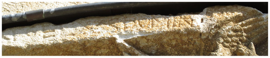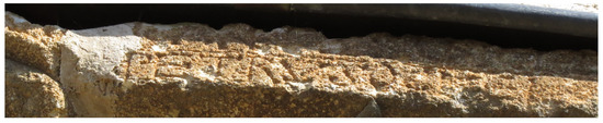 The figure in apotheosis could represent the ascended Christ when, as described in Luke 24:50–53 and Acts 1:9–11, Christ physically departs from Earth by rising up to Heaven, forty days after His resurrection (Palazzo [2014] 2017, p. 144).15 Although, in these examples, the angels do not lift Christ by his wrist, there are a few instances in Romanesque sculpture where Christ is carved in ascension, lifted by two angels (Hearn 1981, pp. 119–38; Vergnolle 2008, pp. 179–99; Poilpré 2005; Mathews 1999; Réau 1955 and van der Meer 1938).16 Additionally, as Secret suggests, the seated male figure could represent a Maiestas Domini—Christ seated on a throne as the ruler of the world, from the Book of Revelation—an interpretation shared by Palazzo, who connects the scene to Isaiah’s vision from Isaiah 6:1–7 (Secret 1967, p. 20 and Palazzo [2014] 2017, p. 144).17 Not only could the polysemic apotheosis figure from Besse be interpreted as the ascended Christ, but it is also depicting a variation of the standardized Christ in Majesty iconography, frequently found on tympana and frescoes adorning numerous Romanesque portals and apses.18 Moreover, in his study of the portal, while retaining the hypothesis that the figure in apotheosis is indeed Christ in Majesty, Secret mentions that it is accompanied by the words PETRUS and ten other illegible letters (Secret 1968, p. 229). Dubourg-Noves is later able to decipher other parts of the missing gloss [A]NGELUS DOMIN[I] … AN…S..N..EL… PETRUS O…E (Figure 19 and Figure 20).19 Dubourg-Noves concludes that the figure does not portray Christ in Majesty, as was previously suggested by Secret; instead, he maintains that the figure represents Saint Peter the Exorcist (also known as Saint Peter in chains/Saint Pierre-ès-Liens), a third-century martyr (Dubourg-Noves 1982, p. 250).20 Dubourg-Noves suggests that the braided pattern carved around the outer archivolt, which frames the figure in apotheosis and the angels, creates a stylized reference to Saint Peter the Exorcist’s double-chains (Figure 2(A, 6) and Figure 4) (Dubourg-Noves 1982, p. 250).