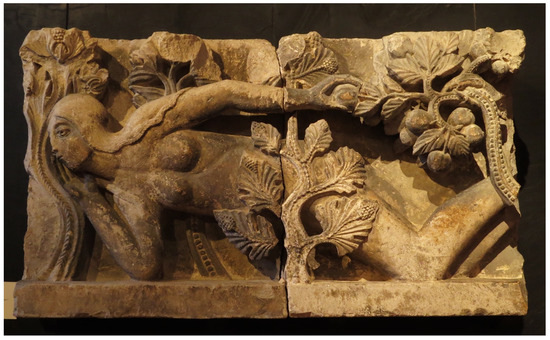 This leads to the problem of the Temptation and Fall of the clothed Adam and Eve in the centre of the inner archivolt of Besse (Figure 2(B) and Figure 23). I propose that this scene highlights their fallen state through their relapse on earth in a similar manner to that in the apocryphal text Vita Adae et Evae (Life of Adam and Eve) (9th to 12th c.), and the sacred dramas of the Ordo representacionis Adae (commonly known as The Play of Adam, Jeu d’Adam, and le mystère d’Adam) (mid-12th c.), or The Conflict of Adam and Eve with Satan (also called the Book of Adam and Eve) (5th–7th c.), to mirror the churchgoers’ inherited fallen state.40 Filling in a few gaps and addressing questions related to the Book of Genesis, apocryphal texts and sacred plays, liturgical and vernacular dramas concerned with Genesis are important for the understanding of medieval depictions of the Original Sin, along with the female gender construct through Eve’s figure. As Vita Daphna Arbel points out, they too were “shaped by everyday life situations and by fluid communication between living people who… express[ed] and negotiate[ed] diverse theological and ideological notions” (Arbel 2012, p. 9). In that sense, although it is not certain how often apocryphal texts were employed in the creation of Romanesque art, they can be studied in parallel to Eve’s and Adam’s sculptural bodies, which, as text carved in stone, were shaped within the same medieval sociological context.
