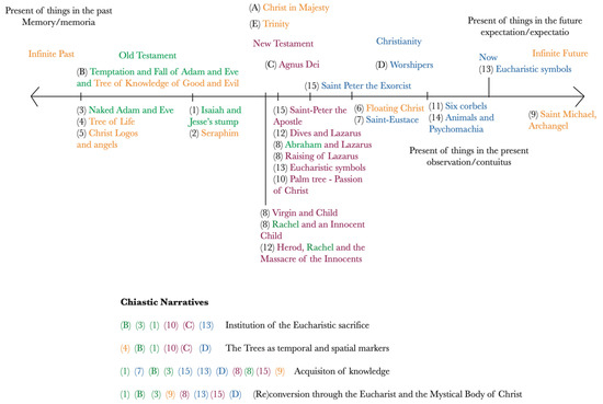 | 60 | Eternity here refers to the space and time of God. According to Christian belief, God exists in eternity—He has no beginning and no end. Eden and the tree have a beginning, but no end. Saint Michael the Archangel has a beginning but exists in eternity. Finally, the possible Abraham and Lazarus are carved in Paradise, in God’s eternal realm. Writing about time, Stephen Gould differentiates two ways of understanding time: “time’s arrow”, and “time’s cycle”. In the time’s arrow mode, “history is an irreversible sequence of unrepeatable events… and each moment occupies its own distinct position in a temporal series”. In time’s cycle, “events have no meaning as distinct episodes… fundamental states are immanent in time, always present and never changing”. See (Gould 1988, pp. 10–11). Additionally, in City of God, Saint Augustine presents a model of time where time is “neither lineal or cyclical, but both, and various units move in different ways—forward, backward, some simultaneously, some synchronized, some neither…There are places where time will be unraveled and where structures will be open-ended”. His model was translated in the Middle Ages and gained a higher level of complexity. See (Fassler 2010); Saint Augustine, City of God, 22.30. See also (Colish 1978). Paul Ricœur explains eternity as “forever still (semper stans)” in contrast to things that are “never still”. See (Ricœur 1984). |