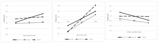 The results suggest that the developmental period moderates the relation between each style of identity formation and the overall level of religiosity while controlling for the other two styles and gender. While the interaction effect significantly (although very slightly) increases the level of the explained variance (R2 change) in the normative style model, for the informational style model, the significance of the R2 change is at the level of statistical tendency. The R2 change in the diffuse-avoidant style model is non-significant (p < 0.12). Based on the rules of moderation analysis with multicategorical variables (), the significance of the interaction effects means that the overall level of religiosity is explained by the informational style differently in emerging adulthood in comparison to adolescence, and by the normative and diffuse-avoidant styles in the early adulthood group differently than in adolescence. The exact level of the conditional effects of the explanatory variable on the dependent variable (coefficients from the regression analysis) across the age groups has been shown in Figure 1.