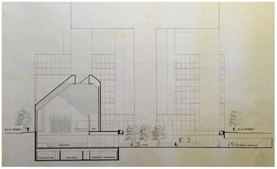 The CPC used the resolution to encourage development in Midtown, and low-rise buildings throughout the neighborhood were demolished to make way for the significantly larger buildings permitted under the new zoning. Many houses of worship left Midtown during this period, as the residential properties that formerly housed their members were largely destroyed. However, the congregation of St. Peter’s Church determined not only to continue worshipping at their current location on the corner of 54th Street and Lexington Avenue, but also to use this moment of neighborhood transition to “become a caring heart in the middle of Manhattan” (). They found an unlikely ally in Citicorp. The bank wanted to build a new headquarters in Midtown and approached St. Peter’s with the idea to redevelop their block into a community hub. The congregation of St. Peter’s recognized this as a valuable opportunity to leverage Citicorp’s financial backing to their benefit. Led by their ambitious young pastor, Rev. Ralph Peterson, the congregation voted to enter a condominium agreement with the bank. They merged their adjacent zoning lots and transferred St. Peter’s air rights for construction of a new office tower. However, the congregation shrewdly negotiated that the agreement would include the demolition of their existing neo-Gothic church building and construction of a new modern church on the same site to better serve their evolving ministry.
