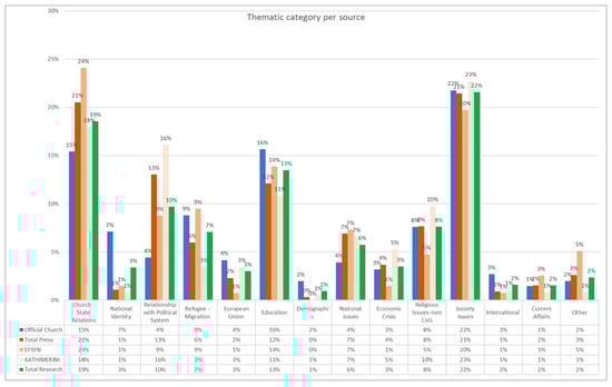 Thematic category per source. Source: Official website of the CoG (www.ecclesia.gr, accessed on 17 March 2022) and newspapers (EFSYN and Kathimerini). Where the height of the bars with the same figures is slightly differentiated, this is due to the value rounding process performed by the statistical program used for the current research (IBM SPSS).