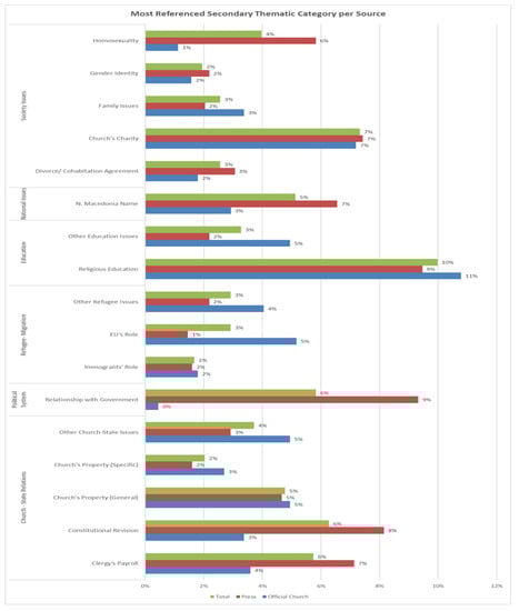 Most referenced secondary thematic categories per source. Source: official website of the CoG (www.ecclesia.gr, accessed on 17 March 2022) and newspapers (EFSYN and Kathimerini). Where the height of the bars with the same figures is slightly differentiated, this is due to the value rounding process performed by the statistical program used for the current research (IBM SPSS).