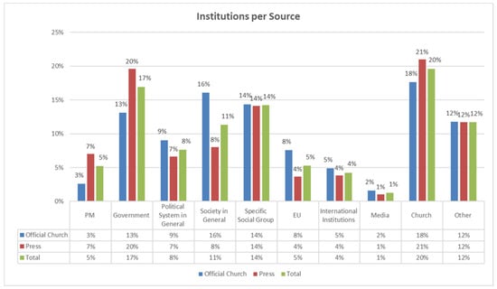 Institutions per source. Source: Official website of the CoG (www.ecclesia.gr, accessed on 17 March 2022) and newspapers (EFSYN and Kathimerini). Where the height of the bars with the same figures is slightly differentiated, this is due to the value rounding process performed by the statistical program used for the current research (IBM SPSS).