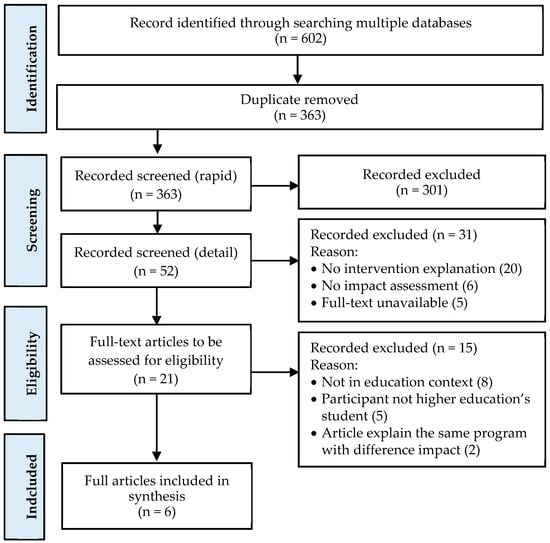 There were 602 identified records from the six search databases. After similar findings were excluded, 363 records were screened and identified for their conformity with the inclusion and exclusion criteria. The records were excluded because the focus of the studies were not empirical intervention programs. In addition, there were several records outside the educational settings, or full-text articles were not available. Finally, there were 6 records that were included in the synthesis, as summarized in Table A1 (Appendix A).