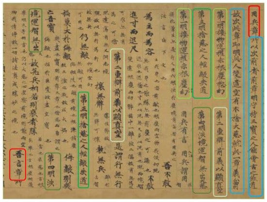 Excerpt of Dunhuang Manuscript P 2517, Gallica, Bibliotheque Nationale de France, Pelliot ms 2517. Daode jing yishu, chapter 69: chapter title (red), structuring commentary (blue), synopses of subdivisions (different shades of green) marked by author.