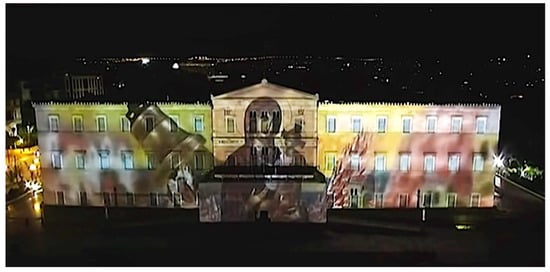 It is instructive to recall that Hagia Sophia remains in the Greek collective imagination both a religious and national symbol, since the Byzantine Empire is perceived to be one of the greatest accomplishments of the Greek Nation throughout its historical course from ancient to modern times. A recent illustrative manifestation of this belief is a video made by the Greek Armed Forces, which was projected on the Greek Parliament façade on 21 November 2020 (see Hellenic Parliament TV 2020). The choice of the day is not accidental; it is both the Armed Forces Day and the popular religious feast of the Entry of the Holy Theotokos into the Temple. The video presents great war events from the Classical, Byzantine, and Modern periods of history; thus, it reproduces the ideology of an uninterrupted national continuity: the battle of Marathon (490 BC); the ‘ygro pyr’ [liquid fire] weapon that was developed by the Byzantines in the 7th century; the Greek War of Independence (1821–1829); the Macedonian Struggle (1904–1908); the First World War (1914–1918); the Greco-Italian War of 1940, as well as images that stress the current military strength of Greece. But even more noteworthy as regards the bond between religion and politics was the projection of the icon of Holy Virgin (patron saint of the Greek Armed forces), holding the Christ child, and accompanied by images and sounds of church bells, at the center of the Greek Parliament. The message is clear: Theotokos (a religious symbol) is protectress of the Parliament (symbol of secular democracy); thus, religion and the Church not only cannot be separated from the public political domain, but there are also vital for a safe state. This reminds us the perception of Theotokos as protectress of the Byzantine walls and of Constantinople in general, which bore the characteristic name of ‘Theotokoupolis’, that is ‘city of the mother of God’ (see Tomadaki 2021). However, now this depiction is being reproduced in the totally different historical environment of secular modernity (Figure 1):