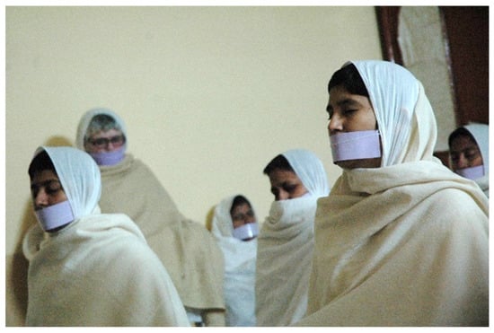 Before the COVID-19 pandemic, Jains would rarely have framed the muhpattī in terms of public health benefits as its shape, purpose, and usage is too distinct from the medical face mask. Traditionally, the muhpattī is an ascetic attribute used by Mūrtipūjaka, Sthānakavāsī, and Terāpanthī ascetics. Depending on their sectarian tradition, they wear the muhpattī permanently or only during rituals such as the pratikramaṇa (a ritualized repentance ceremony for any harm committed, cf. Figure 1) or when speaking, in which case they will simply hold the muhpattī in front of the mouth. As each one of these sects has its own distinctive muhpattī, the muhpattī creates a visual difference, serving as a sectarian marker. In addition, some groups of image-worshipping lay Jains wear a muhpattī when performing a pūjā to the images of the Tīrthaṅkaras (cf. Figure 2). The muhpattī is thus first and foremost an ascetic attribute for monks and nuns and a worship-implement for lay followers. Ideologically, the muhpattī is typically framed within the principles of non-violence (ahiṁsā) and self-control (saṃjama) (Garai 2020, p. 50). Kaushal J. Gandhi and Aadish Surana, both quoted earlier, framed the muhpattī within the principle of non-violence towards one-sensed living beings (ekendriya jīvas). In terms of coverage, there are also essential differences between the face mask and the muhpattī. Unlike the face mask, not all muhpattīs cover the mouth and the nose (cf. Figure 3). The muhpattī for ascetics usually covers only the mouth, if at all (cf. above).