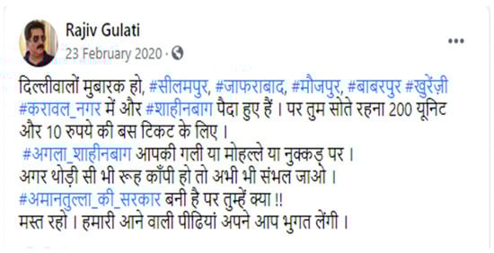 In the days leading up to the riots, the atmosphere in Delhi remained communally charged, with the top leadership of the BJP criticizing the anti-CAA protests. In his first election campaign rally, Modi singled out the protest sites in Muslim-dominated areas of Seelampur, Jamia and Shaheen Bagh, calling the demonstrations over the Citizenship bill an “experiment” and not merely a “coincidence…it is a political design with an intention to destabilize the harmony of the country” (TNN Staff 2020), insinuating a pro-Muslim “conspiracy” (TNN Staff 2020) (see Figure 1 and Figure 2).
