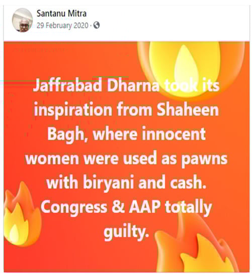 Figure 2. Facebook post on 29 February, after the riots blaming opposition parties for the Jaffrabad protests—which led to violent clashes—as it failed to take action against Shaheen Bagh which was the inspiration for anti-CAA protests.