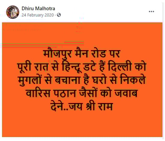 Thousands of BJP supporters and Hindu groups assembled at Jaffrabad and Maujpur to clear the protest site, spurring violence that lasted for over five days. An investigation by researchers (Desai 2020) and other news media (Sagar 2021) show Hindutva groups and members affiliated with the RSS and Bajrang Dal, invoking the Hindu card for planning and mobilizing crowds in northeast Delhi in the days leading to the riots. Dozens of Facebook Live videos and posts in Hindi delivered Islamophobic commentary and issued clarion calls to Hindus to join the holy war against anti-nationals (See Figure 3, Figure 4 and Figure 5 as examples).