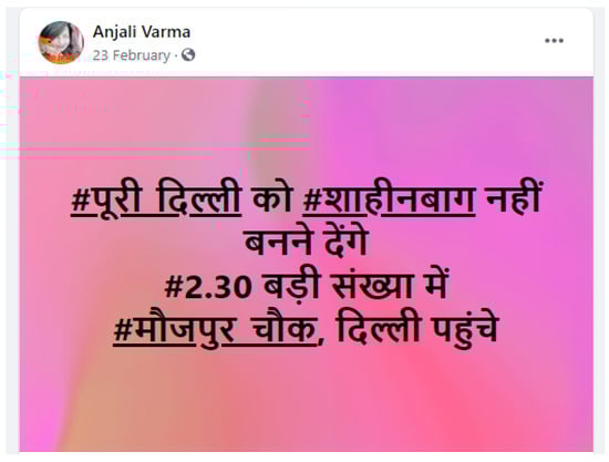 Figure 4. Facebook post on 23 February inviting people to assemble in northeast Delhi. “We will not let the entire Delhi turn into #ShaheenBagh. Reach #MaujpurChowk #2.30 pm in big numbers”.
