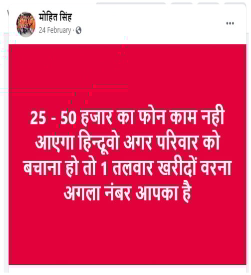 Figure 5. Facebook post on 24 February calling people to arm themselves. “25–50,000 phones will not be useful, Hindus if you want to save your families then buy a sword. You are next in queue (getting killed)”.