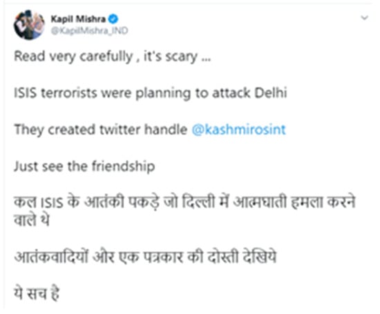 Figure 7. BJP leader Kapil Mishra’s tweet with false information on IS terrorists planning a suicide attack in Delhi.
