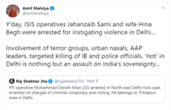 Figure 8. BJP IT cell head Amit Malviya’s tweet falsely linking the arrest of IS inspired couple with Delhi riots.
