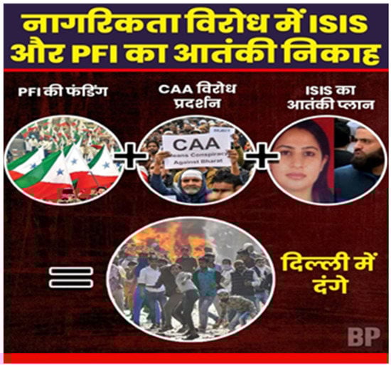 The narrative tried to transfer the blame from Hindutva groups to a fictitious terror alliance between IS and Islamic organization Popular Front of India (PFI), which is under surveillance by the NIA for supporting radical extremism and funding the CAA protest movement (see Figure 9). By trying to link the Islamic State with an Indian Islamic organization, Hindutva groups attempted to argue that shady Islamic forces internationally and nationally had a hand in provoking the anti-CAA protests and instigating violence.