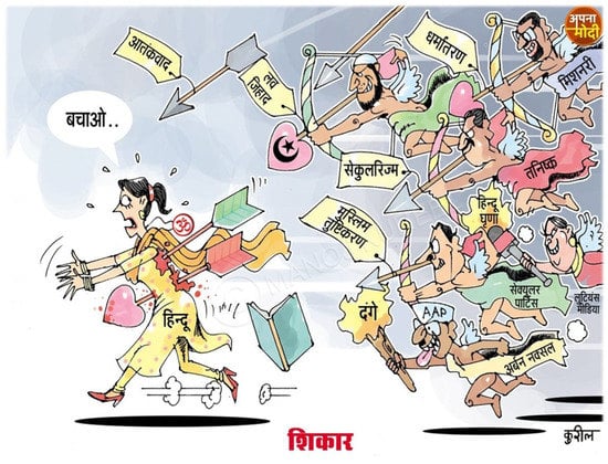 Figure 10. Memes and caricatures circulated on Facebook depicting helpless Hindu girls trapped by Muslims. Save Hindu girls from Muslims (top) is a popular trope used to alert Hindus from forming friendships or relations with Muslims. Cartoon (bottom) shows Hindu.