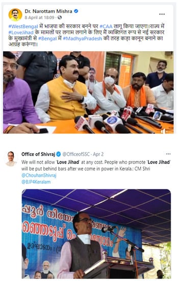 Figure 11. Tweets by BJP senior leaders during election campaign in April 2021, promising legislation against ‘love jihad’ if BJP is elected. Home Minister Narottam Mishra in West Bengal (top) and Chief Minister Shivraj Chauhan (bottom) at a rally in Kerala.