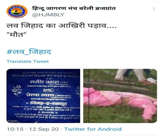 Less than six months after Muslims were targeted in the Delhi riots and blamed for deliberately spreading the COVID-19 virus, the Muslim community was again at the center of a raging storm related to accusations of them waging “Love Jihad”. The term was devised by right-wing Hindu nationalist organizations and refers to the conspiracy that Muslim men honeytrap unsuspecting Hindu women into marriages to convert them to the fold of Islam (see Figure 10, Figure 11 and Figure 12). The idea was to oversaturate the level of threat presented by love jihad to justify anti-Muslim violence, thus designating the Muslim man as a dangerous threat. Scholars like Charu Gupta and Muhammadali P. Kasim have noted that fear of inter-religious marriages between Muslims and non-Muslims intensified under colonialism. These anxieties are embedded in casteist and gendered dynamics beyond religion. In fact, since the 1920s many patriarchal Hindu leaders especially feared that lower caste and Dalit women would marry Muslim men to escape the stigma of caste, and today the phenomenon of “Love Jihad” cannot be extrapolated from broader efforts by Hindu Nationalists to legislatively ban people from converting to non-Hindu faiths.
