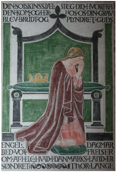 Its vaguely medieval appearance notwithstanding, the painting is revealed by its inscription as a work of the twentieth century. Although the piece is not signed, it was painted by Joakim Skovgaard (1856–1933), who is known for his frescoes in the reconstructed cathedral of Viborg (1899–1907), among other works (Andreasen and Dumreicher 2011). The text clearly posits the figure depicted in the painting as a kind of saint, asking for her intercession on behalf of a threatened or damaged Danish nation. This young woman, addressed as “Dagmar”, is not a figment of the artist’s imagination, but a known medieval queen of Denmark.