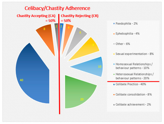 One more point first needing inclusion here is that clergy also mix freely and socially within the faith and broader communities of their ‘clients’, and with them and their families. Through their religious ministry, they acquire deeply personal knowledge which obviously would stay with them as they mix socially. As such, CSMAA grooming utilising this knowledge can easily occur both within and externally to pastoral contexts. Clergy sexual misconduct within pastoral contexts is always serious, and is in some jurisdictions now classified as criminal behaviour (de Weger 2020, pp. 63–67). As such, to highlight the dual-contexts reality and assist clarity, each context and scenario will, therefore, be defined positionally as being ‘pastoral’ or ‘social’ (sometimes both). Though it can only be speculation here, each will also be allocated the most likely hemisphere of Sipe’s 50/50 clergy acceptance or rejection of celibacy/chastity rules (see Figure 2):