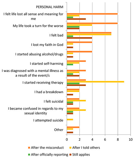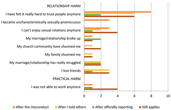 Whether intentional or not, professional/clergy sexual misconduct produces trauma/harm for primary victims. However, it also produces harm for others in victims’ lives (Rutter 1989, p. 16; Cooper-White 1991; Peterson 1992, pp. 105–40; de Fuentes 1999; Flynn 2003; Tschan 2014, pp. 29–43). With any definition of CSMAA, all harms produced must be acknowledged.