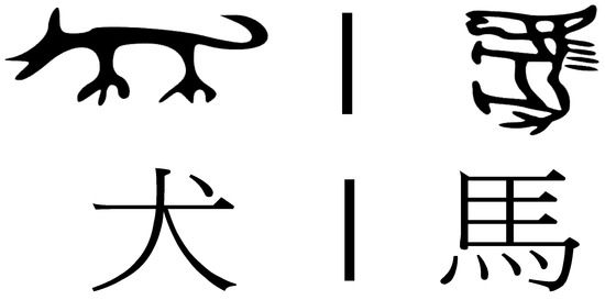 As Daoism is an indigenous Chinese religion, Chinese (Hànyǔ 漢語; zhōngwén 中文) is the primary language. Chinese is a character-based language, with characters consisting of “radicals” and many characters being pictographs and ideograms. This raises yet another question about the animal, namely, the language question. The English “animal” derives from the Latin animālis (“having breath”).6 This term in turn becomes associated with a larger modern classification and taxonomy, including amphibians, birds, fish, invertebrates, mammals, and reptiles. One interesting question is the relative standing of insects. In Chinese, the parallel character is shòu 獸 (“animal”), which contains the quǎn 犬/犭 (“dog”) radical, and wù 物 (“being/thing”), which has the niú 牛/牜 (“ox”) radical. Wù appears in the classical Chinese Daoist phrase wànwù 萬物 (lit., “10,000 beings/things”), which refers to everything in existence (both “animate” and “inanimate”), and the modern Chinese dòngwù 動物 (lit., “moving being/thing”), which translates “animals” (see zōngjiào 宗教 [lit., “teachings of the ancestors”] for “religion”). There also is some connection to the classical and foundational Daoist concept of zìrán 自然 (lit., “self-so”), which sometimes refers to “Nature” as a whole. Given the linguistic characteristics of Chinese, and in contrast to alphabetic languages, a “dog” cannot be a “horse” (see Figure 1).