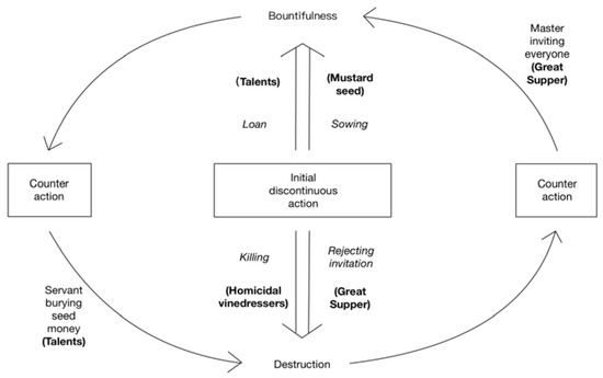 In the parable of the Talents, the enterprising servants combine the “letting grow” and the “giving back” into one and the same process. In return, they are provided “much” (Mt 25:21) or (in the way Luke specifies their reward) the command of a city for every mine they have earned (Lk 19:17). Originally, the process of exchange and growth was inseparable from the dynamism of life itself. The parable of the Mustard Seed vividly illustrates such propensity. However, life dynamism can be hindered by the refusal of some of the members of a specified community to engage in the conduct that sustains this process of growth and exchange. The parable of the Great Supper exemplifies such refusal. The first guests were chosen because they were part of a presumably high-level patron–client network (a fact induced from the elevated, perhaps royal, status of the inviter)—a network they choose to break with various justifications: purchase of land or of five pairs of oxen, or yet marriage (Lk 14:18–20). Such an interruption of the exchange, which greatly weakens the social capital of the inviter, breaks the multiplication of the benefits that could be expected in the course of time. However, at this point, a new note is heard: the “growth” will turn out to be that of the number of guests who, in the end, fill the room—similar to the birds come to “inhabit” (kataskēnoō) the great vegetable plant that springs up from the ground. Guests and birds do so without having to offer any counterpart. The “network” meal is transformed into a communal meal (on the contrast between these two types of meals in the Roman Empire and in an even wider area, cf. Jones 2007, pp. 225–26). An unexpected decision re-launches the process of growth through a mechanism that transmutes reciprocity into gratuitousness.