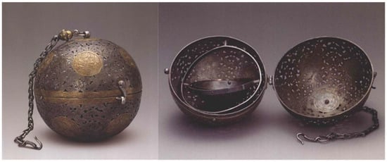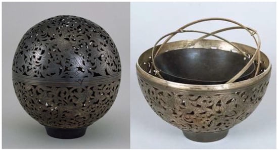 In spite of the fact that Islamic culture does not regard incense in the same way that Buddhism does—incense never became an essential part of Islamic ritual—it was still widely used in the Middle East during the Islamic Golden Age (the eighth to the fourteenth century), when it was reserved for special occasions such as weddings and circumcisions and was used in special places such as mosques and shrines (Ward 1990–1991, p. 67). While the majority of Chinese spherical incense burners are made of silver, most of the Islamic examples are made of bronze, most likely owing to the large amounts of copper (a component of bronze) that were being transported from Europe to Islamic countries from the fifteenth century onward (La Niece 2010, p. 35).