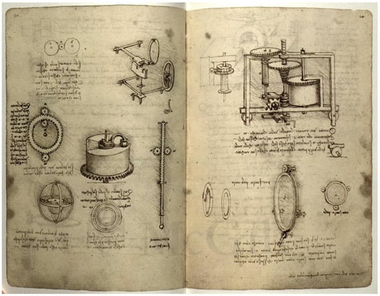 Leonardo da Vinci, Codex Madrid I, Folio 13v. The gimbal in Leonardo’s drawings alludes to a mechanism used on ships to hold a mariner’s compass in place.