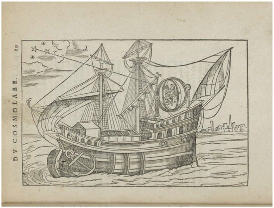 Man seated in a gimballed chair aboard a ship, a drawing from Jacques Besson’s Le Cosmolabe, 1567, p. 29. Source: Gallica Ebooks.