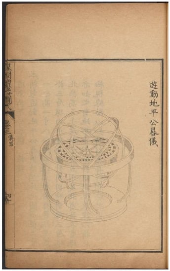 | 3 | Original: “謹按, 本朝制遊動地平公晷儀, 鑄銅為之. 圓座徑二寸一分, 高一寸八分. 內遊環三層, 系日晷地平盤於三層環內, 中施指南針, 周圍時刻線三層, 依北極高三十度, 四十度, 五十度. 北有弧表, 畫線亦如之. 自地平中心出斜線對弧表線, 以指北極, 視線影以知時刻. 為舟行測驗之器”. |