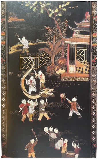 Children taking part in a dragon parade, part of an inlaid lacquer screen in the collection of Dr. Lu Guizhen 魯桂珍 (1904–1991), a co-author of Joseph Needham’s Science and Civilisation in China and the second wife of Needham.