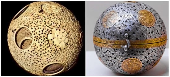 Needham also associated the production of xiangnang with the production of guigong qiu 鬼工球 (turned ivory balls) during the Song period. He pointed out that the turned ivory balls and the spherical incense burners are similar in that both are formed into a round shape using a lathe. I disagree with Needham’s dating, as in reality, the earliest known tangible evidence of concentric ivory spheres produced on a lathe dates no earlier than the seventeenth century. I find that the gilded-silver xiangnang from Famensi is reminiscent in its design of an eighteenth-century turned ivory ball with a floral, open-work pattern that was imported to Poland from China and is housed today in the Wilanow Palace Museum (Figure 10).