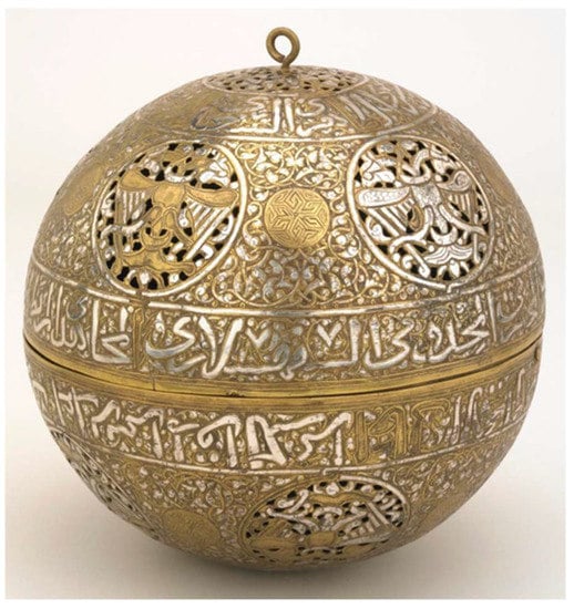 Many museums, such as the Metropolitan Museum of Art in New York, the Victoria and Albert Museum and the British Museum in London, and the Bargello Museum in Florence, now collect spherical incense burners made in the Islamic world, cataloging them variously as either hand warmers or incense burners. Scholars have debated the Islamic spherical censer’s function. Ward noted that the evidence for their employment as handwarmers comes from European sources, which mention them being used on church altars to warm priests’ hands during Mass (Ward 1990–1991, p. 78). I propose that they could have functioned as both hand warmers and incense burners, as they did in China, for incense plays an important role in Christian ritual. It was never only clergy who made use of the spheres as hand warmers; inventories of court treasuries contain references, although uncommon, to spherical objects made of precious metals that were used to warm the hands of members of the lay community as well. In some cases, it is probable that the use of the sphere to generate heat in Europe was a by-product of its earlier use as an incense burner (Auld 2004, p. 112).