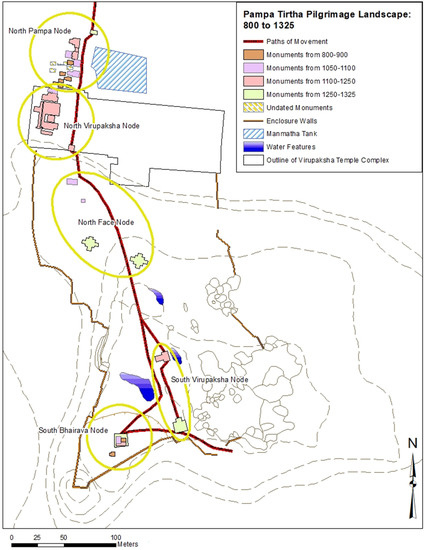 The Hemakuta Hill surface on which temples and shrines were erected measures approximately 300 m long from north to south and 150 m wide (Michell 1992, p. 425). The hill itself is a gently undulating granite shelf, with soil accumulation in some slight depressions. Other depressions act as pools for natural springs or collect precipitation. Overall, the granitic face of the hill creates a setting characterized by microtopographic features. Weaving through these features, natural paths across the face and north foot of the hill organized devotees’ movement in this sacred space. These paths are suggested by several key factors: the undulations and boulder-free areas of the hill, and stone structures that channel passages running from the south end of the Hemakuta Hill to the northern foot of the hill. Over time, the path was enhanced by built features, such as gateways, and the general orientations and placement of shrines and temples that either intentionally faced or faced away from the paths. Through a spatial and temporal analysis, five spatial nodes, or distinct areas, have been identified based on their particular topographic and topological attributes within the Pampa tirtha. The five nodes are in the following locations: the northern flat foot of the Hemakuta Hill (referred to as the north Pampa node); the northern base of the hill, between the slope and flat foot of the Hemakuta Hill (referred to as the north Virupaksha node); the north-facing slope of the hill (referred to as the north face node); the apex of the hill located to the southwest (referred to as the south Virupaksha node); and the depression at the summit of the hill, located at the southernmost end of the site (referred to as the south Bhairava node). The digital reconstruction of Hampi landscape in 800–1325, including the nodes and dominant paths of pilgrim movement, is presented in Figure 2.