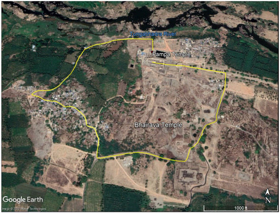 The sacred space of the Hemakuta Hill area provides a unique ritualized and sacred setting for the exploration of ritual movement in a pilgrimage destination. According to South Asian tradition and pilgrimage research (Fuller 2004, p. 209), echoed in the broader field of the anthropological study of pilgrimage (Coleman 2002), the devotee enters into a sacred time and scape in the pilgrimage center, both physically and conceptually distant from their mundane life. The Hemakuta Hill area was and continues to be understood by visitors and local residents as a nucleus of sacred space within a broader sacred landscape. Although the city of Hampi was largely abandoned in 1565, several temples remained active, including the Virupaksha temples established in the 12th century. Modern ethnographic accounts of the current ritual life of the Virupaksha Temple Complex elucidate the bi-annual ritual that involves the ritual activation of the sacred space of the Hemakuta Hill area (Kotecha 1982, p. 73). The ritual itself is known as Giri Pradakshinapatha and consists of a processional circumambulation of the entire hill area (including the northern foot of the hill with the Pampa Temple, memorial structures, and Manmatha Tank area), out to the river and back to Virupaksha Temple with Virupaksha idols, priests and devotees (Figure 3). The path taken demonstrates the local conceptualization of the Hemakuta Hill area as a unit of ritual space. This act of circumambulation ritually re-activates the sacrality of the Pampa pilgrimage space (tirtha) through movement as a ritualized and “symbolic act of veneration” (Bharne and Krusche 2012, p. 202; Kotecha 1982, pp. 73–76).