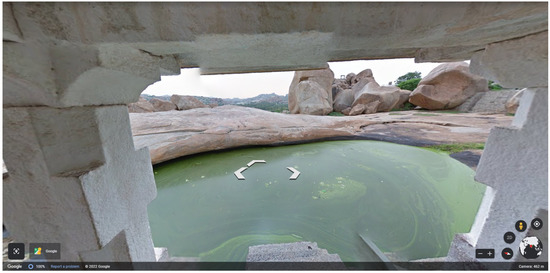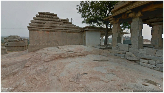 The second Virupaksha node established during this period consists of a Phamsana temple situated at south-east crest of the hilltop. The temple is still functional today. The linga housed in the temple and worshipped by the local Virashaivas is called Mula-virupakshesvara, “the original lord Virupaksha” (Wagoner 1996, p. 157). Thus, this monument is herein referred to as the Mula Virupaksha Temple in the south Virupaksha node. The temple was situated to appropriate a striking microtopographic feature of the granite hill, as it was built immediately in front of and abutting the western side of a spring-fed cistern. The temple is oriented east-north-east (83° east of north), so that stairs leading from the mandapa exit into the pond. Although this orientation prioritizes the view and the physical presence of the pond as part of the node, it prevents the devotee from entering on the axis to which the structure is aligned. Rather, the devotee enters and exits through the south–north axis of the mandapa, mirroring the south–north flow of movement through the larger pilgrimage space, from the hill to the river. Figure 4 shows the view eastwards toward the water feature from the mandapa, and Figure 5 captures the south and main entrance of the temple (whitewashed). This unique mandapa plan frames and directs lines of sight for the devotee once in the sacred space of the temple. Beyond the cistern are granitic boulders beyond which the devotee can see the neighboring sacred hill in the landscape. Leaving the temple via the open bay on the north side of the mandapa, the devotee was provided a line of sight of the other Virupaksha-dedicated structures (that were unobstructed during the 1100 to 1250 period) (Figure 6).