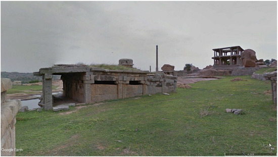 It seems likely that several water features of the Hemakuta Hill area, such as the natural pool of water which developed into the Manmatha Tank, drew inhabitants to this space as a focus for religious activities that took place by the 9th century. There are several examples of such a process occurring at Kashi as well. For example, the well-known Durga Temple is associated with the Durga kund (small lake or pool). The Durga kund began as a small natural lake or pool and was later transformed, due to changing topography, into a manmade tank (Eck 1982, p. 50). Natural water sources preceding a built tank were influential in siting religious structures, because water for ablution was essential for the proper worship and functioning of temples and shrines (Bharne and Krusche 2012, pp. 92–93; Michell 1988, p. 68). Therefore, the particular location for the Pampa Shrine may be thanks to a Manmatha pool. As mentioned, the 12th century Mula Virupaksha Temple was located immediately in front of and abutting a small natural pool of water on Hemakuta Hill in such a way that it completely monopolized access to the pool. Or, perhaps, the placement of the temple was meant to claim the pool’s sacred water as its own, a bold statement by the temple patrons and associated community.